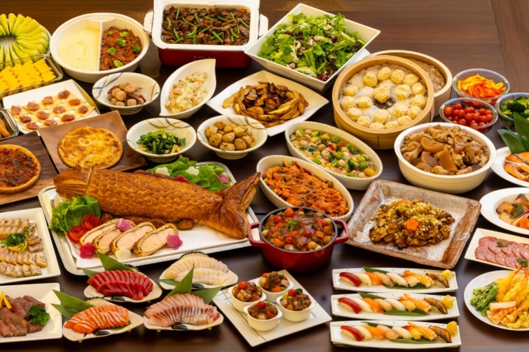 オープンキッチンの鉄板コーナーでの牛ステーキ、目の前で握る寿司やお造り、熱々揚げたての天ぷらやフライをはじめとした、約40種類の出来立ての和洋のお料理を是非ご賞味くださいませ。